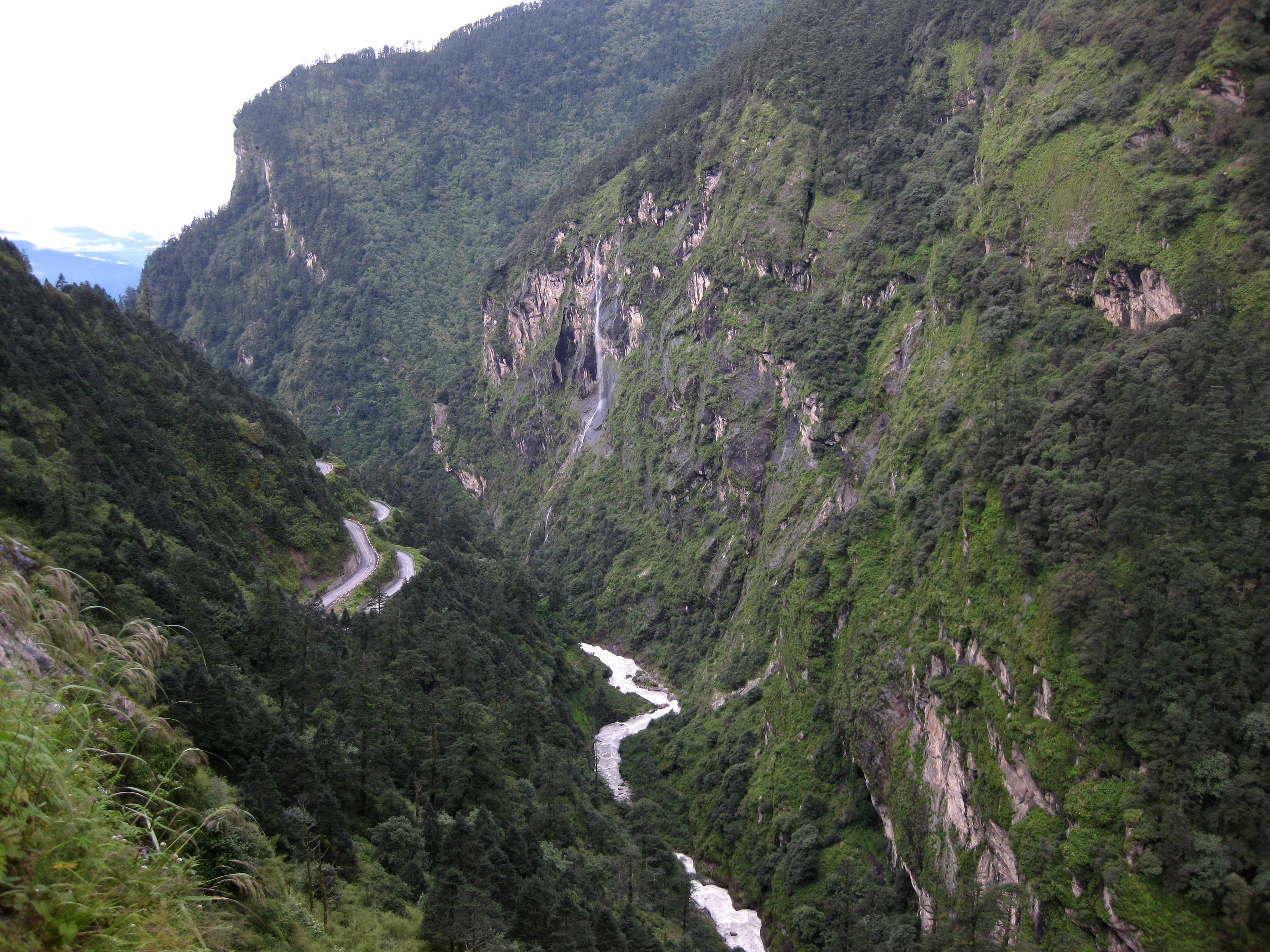 We rode on. What else was there to do? For at least another hour it poured. We seemed to be climbing non-stop. With a slight tail wind, I was too hot with my rain jacket on, but too wet to take it off without getting cold again. Eventually the rain seemed to ease and then, as quickly as it had arrived, it was gone. We could hear a constant rumbling sound – it was rainwater rushing down the streams and rivers alongside the road and even across the road in front of us in places.